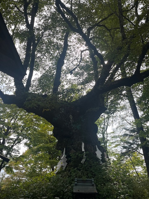 神楽殿を抜けて御神木のしなの木を一周回り、家族の健康、長寿を祈願。